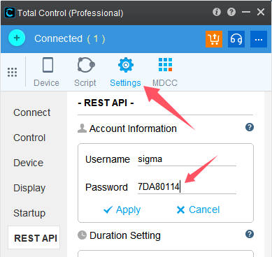 - Open Main Panel → Settings to find the REST username and password (in the example,